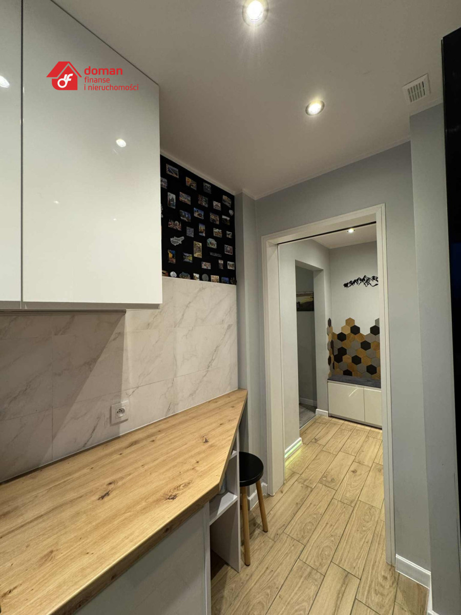 Przesuwne drzwi oddzielają kuchnię od przedpokoju, co zwiększa funkcjonalność i pozwala na wygodne korzystanie z pomieszczeń.